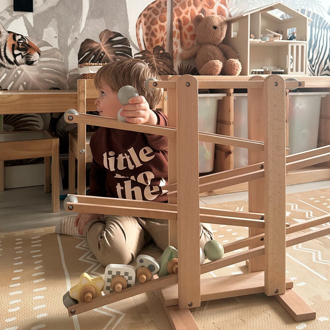 Jednoducho umiestnite loptičku na drevenú dráhu a sledujte jej plynulý pohyb. Vaše dieťa od nej určite nebude môcť odtrhnúť oči. Okrem guľôčok z dreva obsahuje súprava aj dieliky v rôznych farbách a tvaroch. Pri ich kotúľaní a otáčaní sa farby miešajú, čím stimulujú detské zmysly a vyvolávajú úsmevy na tvárach najmenších. Drevený kulodróm vám zaručene poskytne hodiny skvelej zábavy!