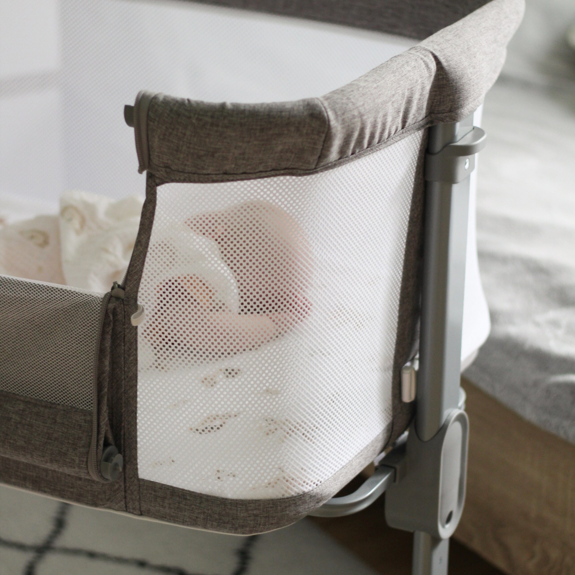 LUNA sa dá bezpečne a pohodlne pripojiť k posteli rodičov vďaka špeciálnym nastaviteľným kotviacim pásom . Jednoducho zasuňte a zaistite postieľku vášho dieťaťa hneď vedľa postele opatrovateľov.