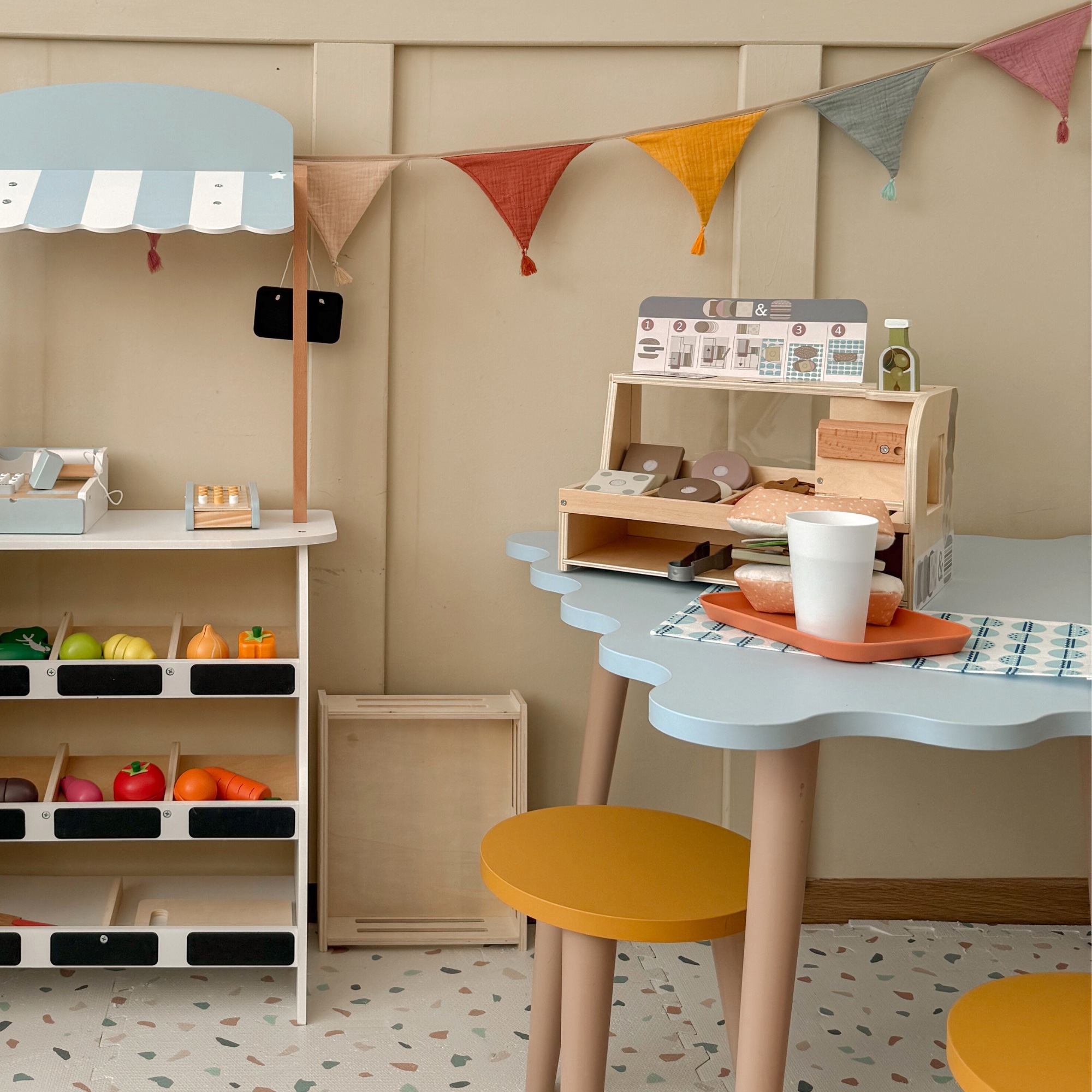 S touto hračkou vybavenou množstvom doplnkov sa vaše dieťa bude môcť vžiť do úlohy predavača sviežich a farebných sendvičov. Veď sendvičový bar, vyrobený z odolného dreva, obsahuje všetko potrebné na ich prípravu. Skutočným vrcholom je pohyblivý krájač, ktorý umožňuje vášmu dieťaťu "krájať" syr alebo mäso. Prísady na sendvič majú suchý zips, takže si môžete ľahko zostaviť chutný sendvič. Teraz už stačí len nápoj a chutné jedlo je pripravené!