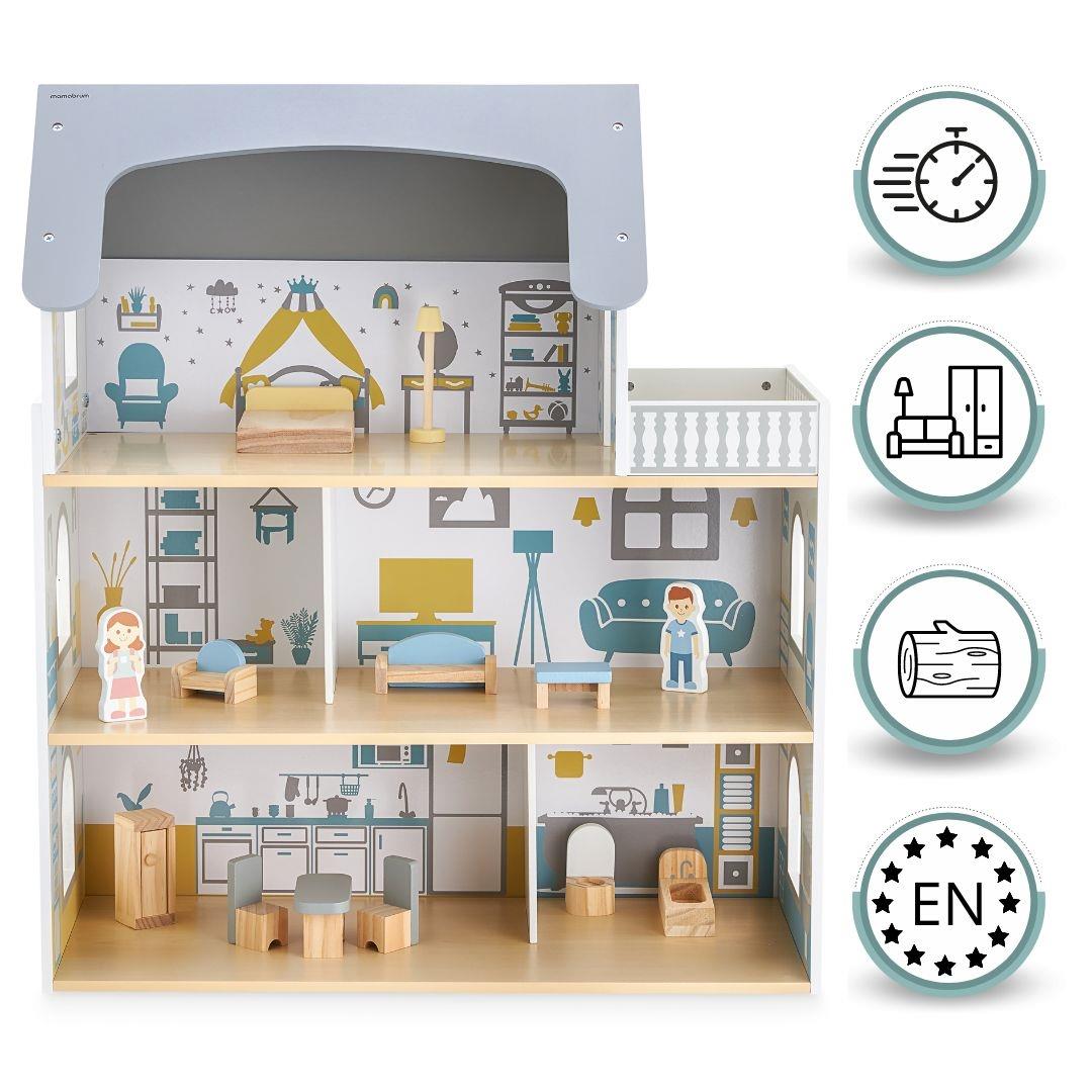 - trojposchodový domček pre bábiky vyrobený z kvalitného borovicového dreva