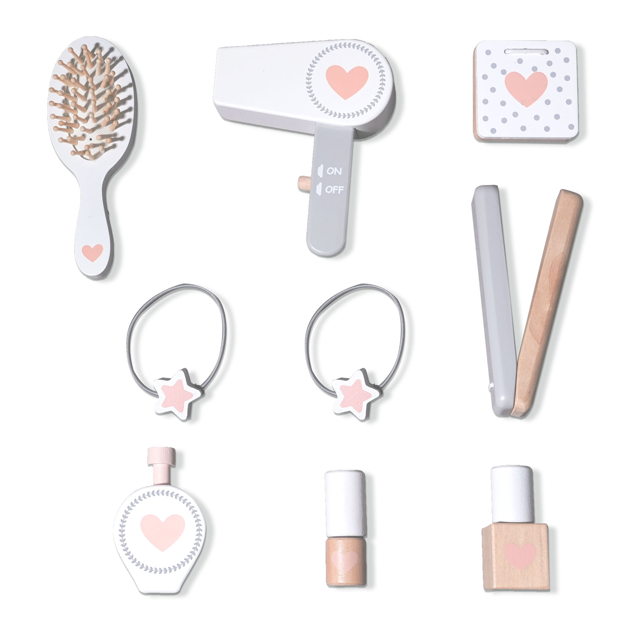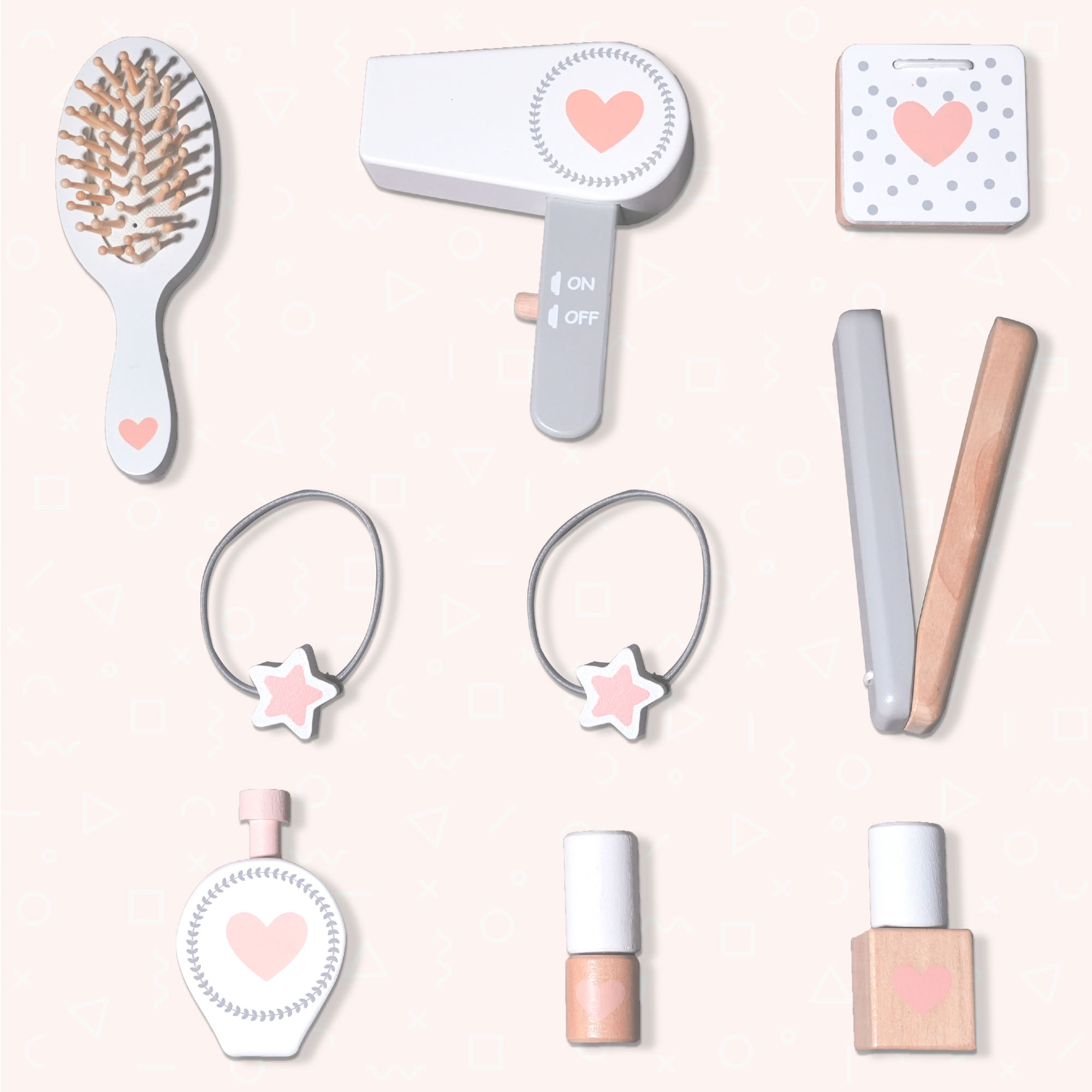 Toaletný stolík MAMABRUM bol navrhnutý tak, aby podnecoval kreativitu a podporoval každodenné hranie rolí. Môže slúžiť ako miesto na česanie bábik, vytváranie jedinečných účesov, ukladanie malých pokladov, ako aj ako stôl na kreslenie a výtvarné hry. Súprava obsahuje až 9 realistických doplnkov pre ešte zaujímavejšiu a pútavejšiu hru, pričom podporuje rozvoj manuálnych zručností a predstavivosti dieťaťa.