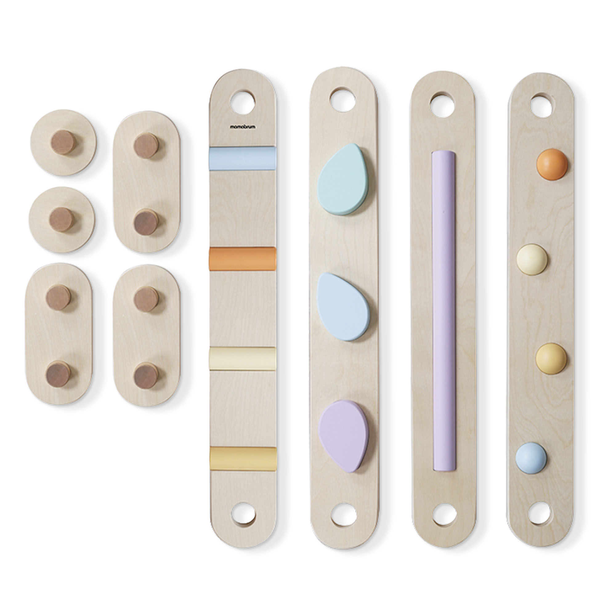 - Každý nosník obsahuje farebné zmyslové prvky: guľôčky, listy, polguľôčky a valček