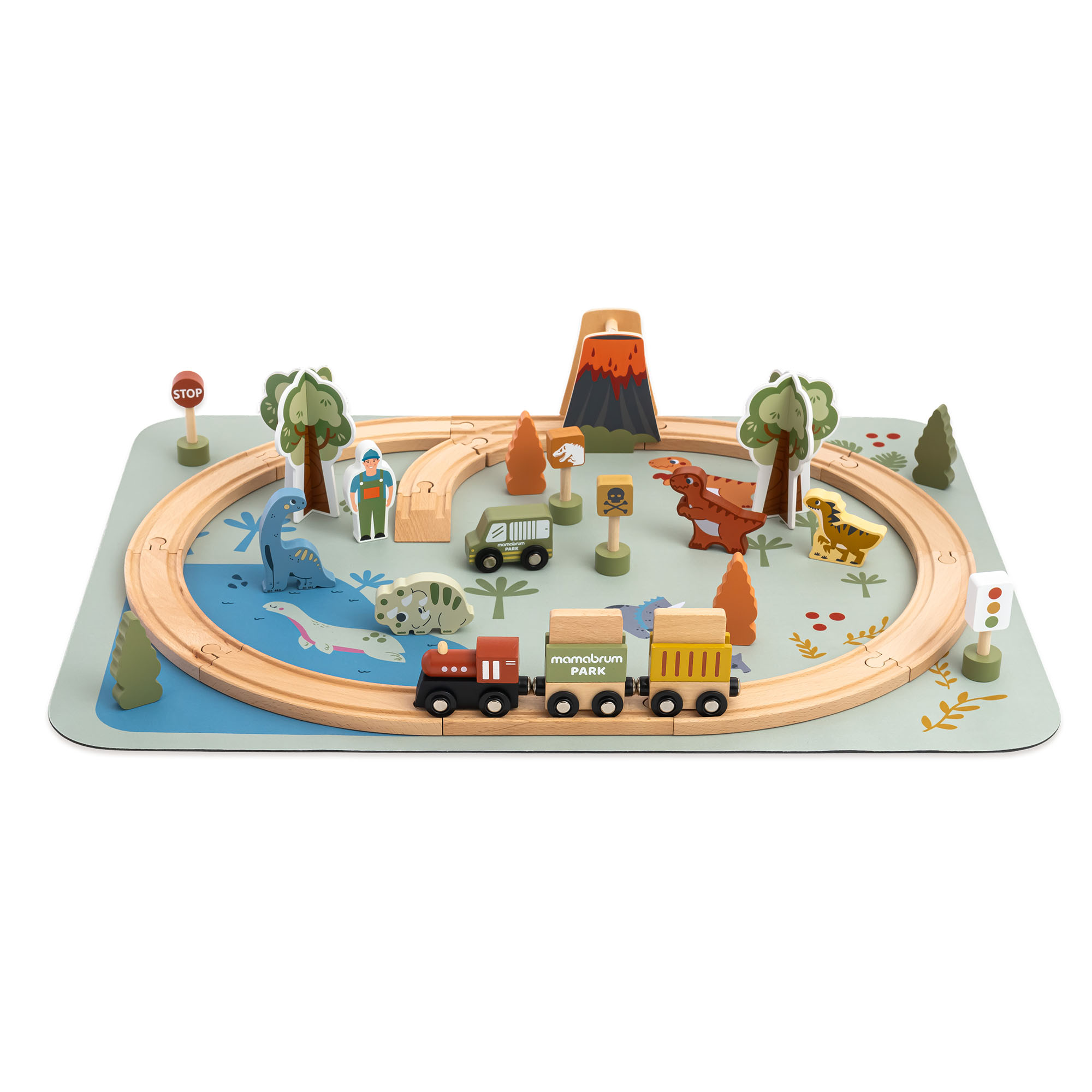 Drevený vláčik Dino Park s protišmykovou podložkou - dinosaury, vláčik, koľajnice, sopka, zvonček