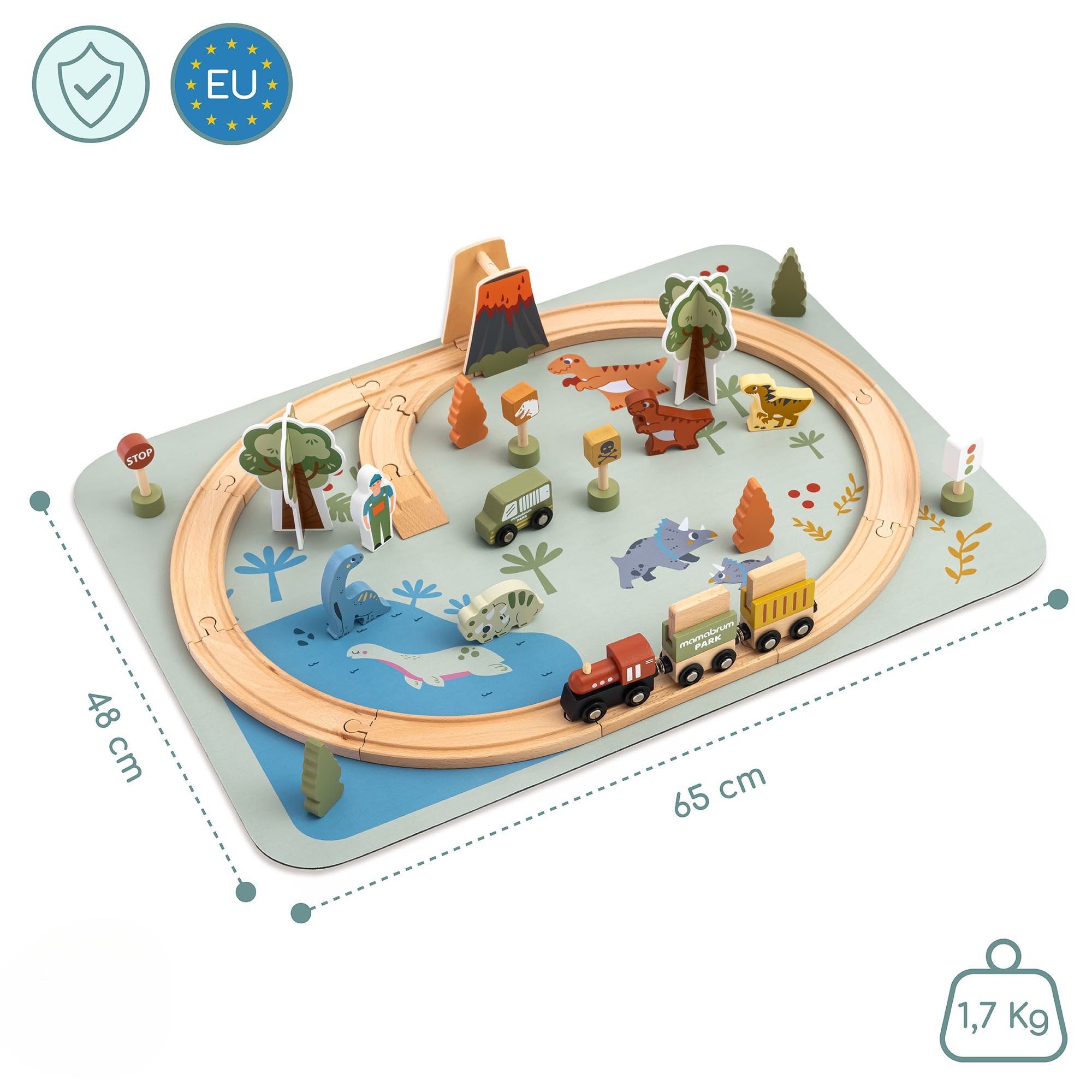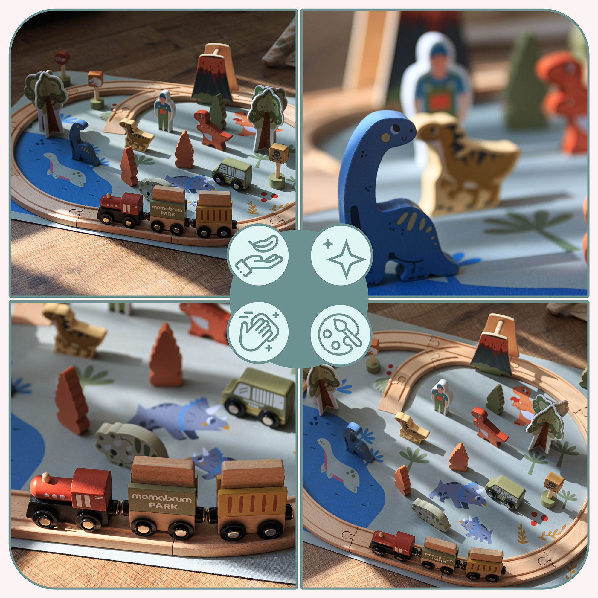 Preneste svoje dieťa do fascinujúceho sveta spred miliónov rokov! Vláčikodráha Dino Park je jedinečná hračka, ktorá spája vzdelávanie, kreativitu a kopec zábavy. Drevené koľajnice, farebná hracia podložka a Jurský park plný atrakcií s dinosaurami zaručia, že zábava nikdy nekončí.