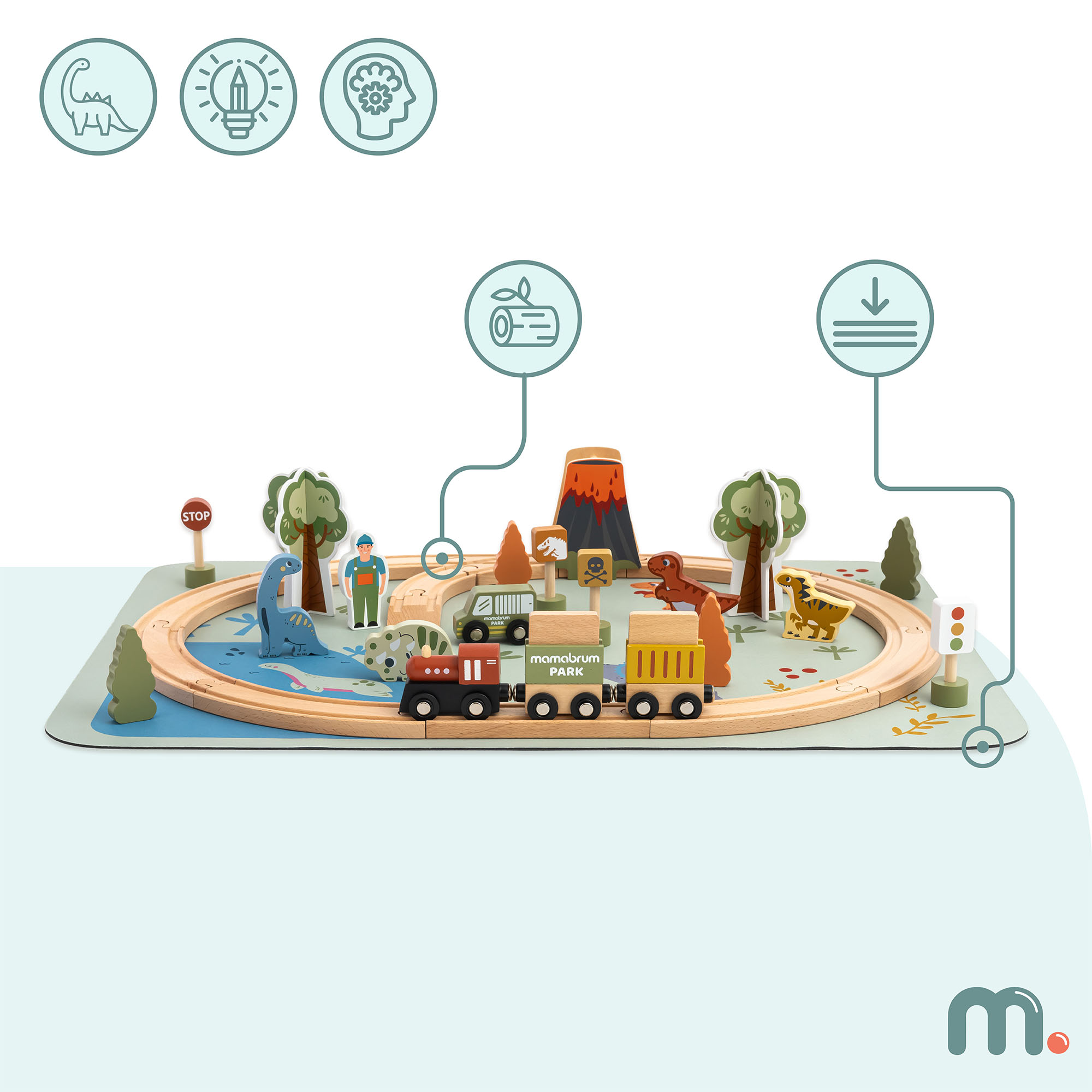 Vláčikodráha Dino Park podporuje vývoj dieťaťa na mnohých úrovniach. Kladenie koľají a premiestňovanie lokomotívy rozvíja manuálnu zručnosť a koordináciu oko-ruka , zatiaľ čo vytváranie vlastných scén rozvíja priestorovú predstavivosť a logické myslenie . Figúrky dinosaurov a doplnky podporujú hranie rolí , ktoré podporuje kreativitu, ako aj sociálny a emocionálny rozvoj.