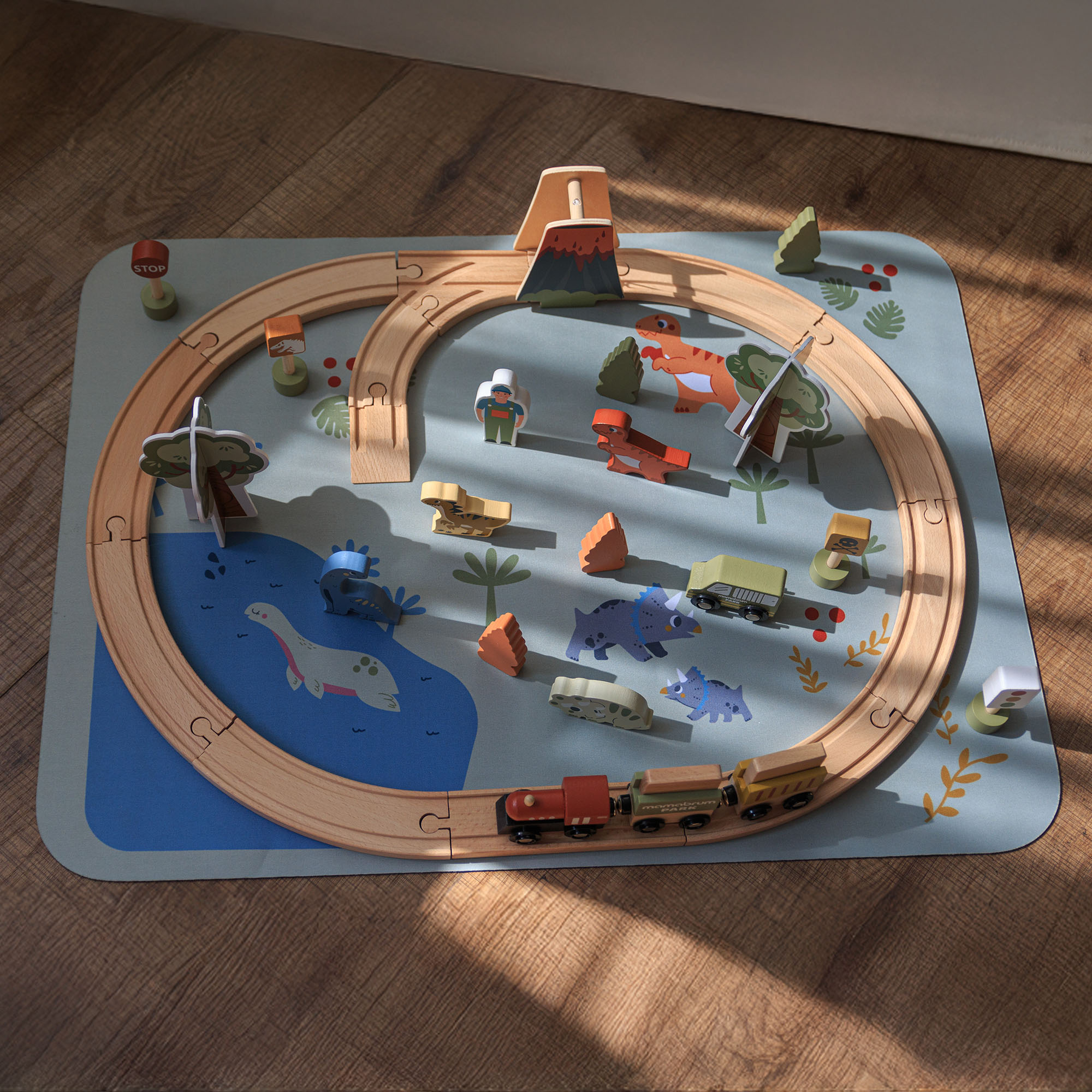 Lokomotíva a vagóny prepravujú náklad cez prehistorickú krajinu a jazda v tvare zvona sopky dodáva ešte väčšie vzrušenie! Vláčik prechádza svetom dinosaurov a malí prieskumníci dopĺňajú trasu dopravnými značkami a stromami. Nie je to len hračka – je to celý svet dobrodružstiev, ktorý si vaše dieťa môže každý deň vytvárať.