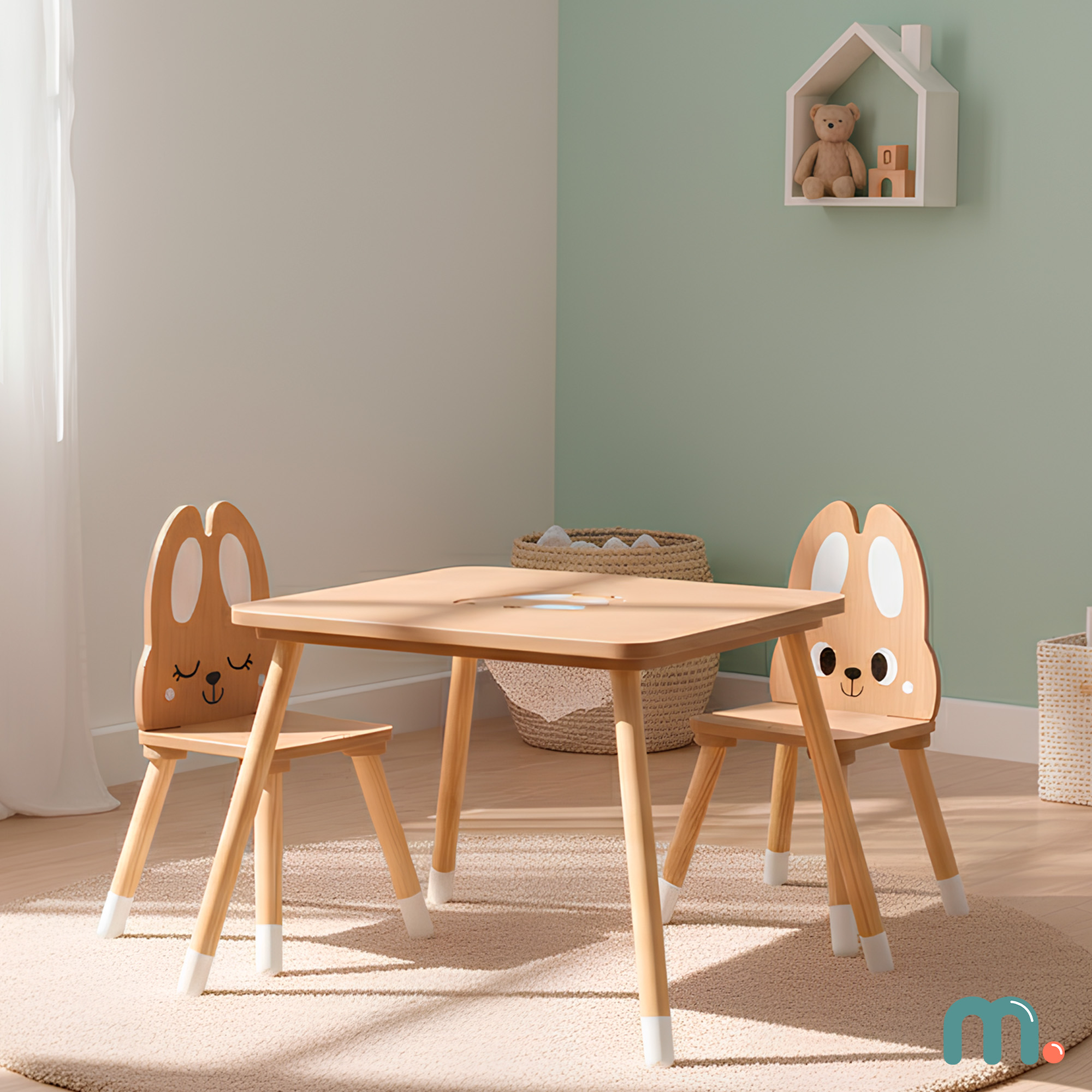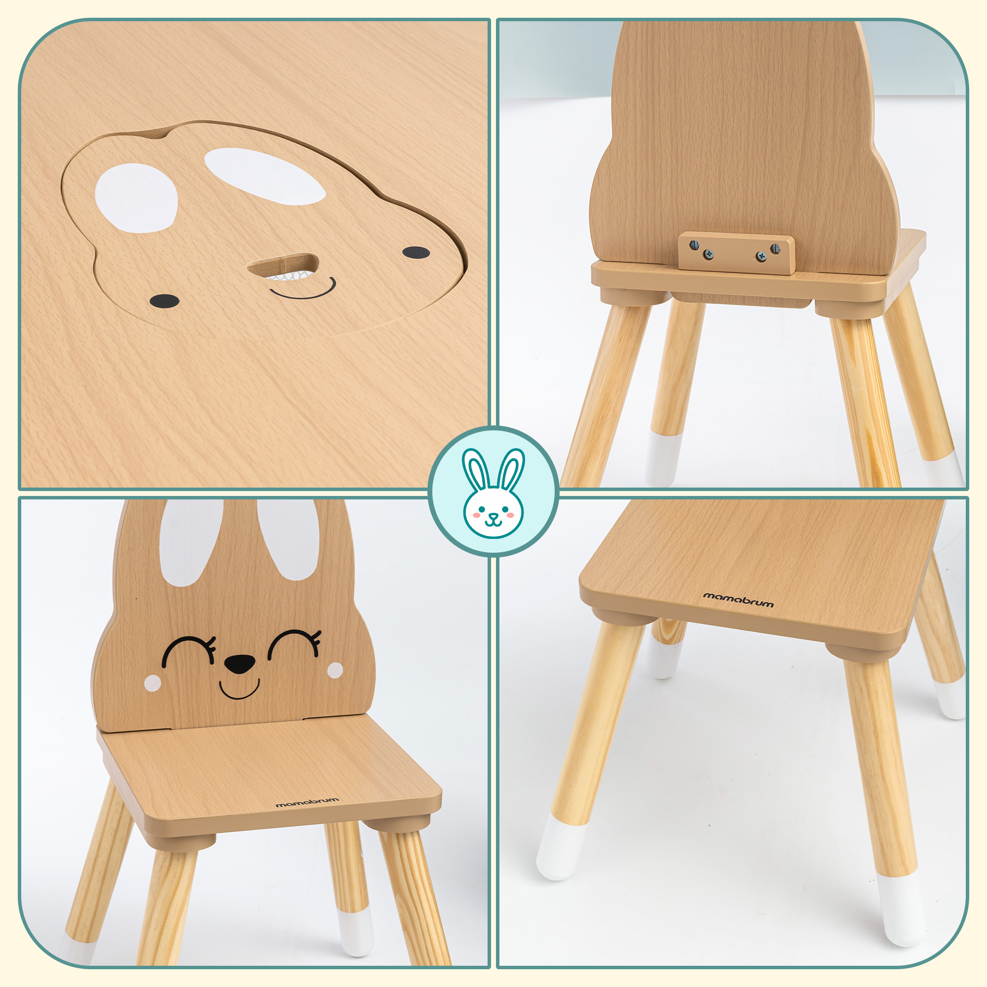 Vytvorte pre svoje dieťa príjemný priestor, kde sa každý deň môže stať novým dobrodružstvom! Sada stola a stoličky Charming Rabbit kombinuje jedinečný dizajn, funkčnosť a solídne remeselné spracovanie . Drevený stôl s centrálnym úložným priestorom a dve stoličky v tvare králika vytvárajú ideálne miesto na kreslenie, učenie, jedenie alebo spoločné hranie.