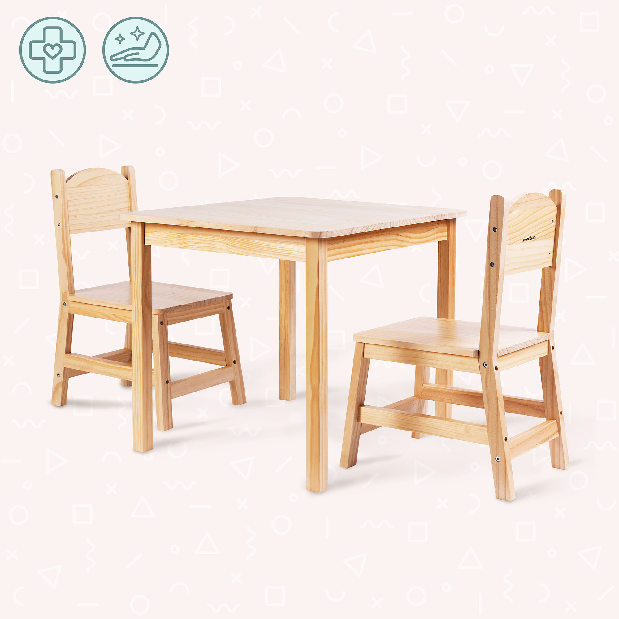 Doprajte svojmu dieťaťu vlastný priestor! – bezpečný, pohodlný a plný možností. Táto drevená súprava so stolom a dvoma stoličkami vytvára ideálne miesto na kreslenie, riešenie hádaniek, učenie, jedenie alebo hranie so súrodencami a kamarátmi. Prírodné borovicové drevo, ergonomický tvar a pevná konštrukcia robia z tohto nábytku perfektný doplnok do detskej izby, obývačky alebo detského kútika.