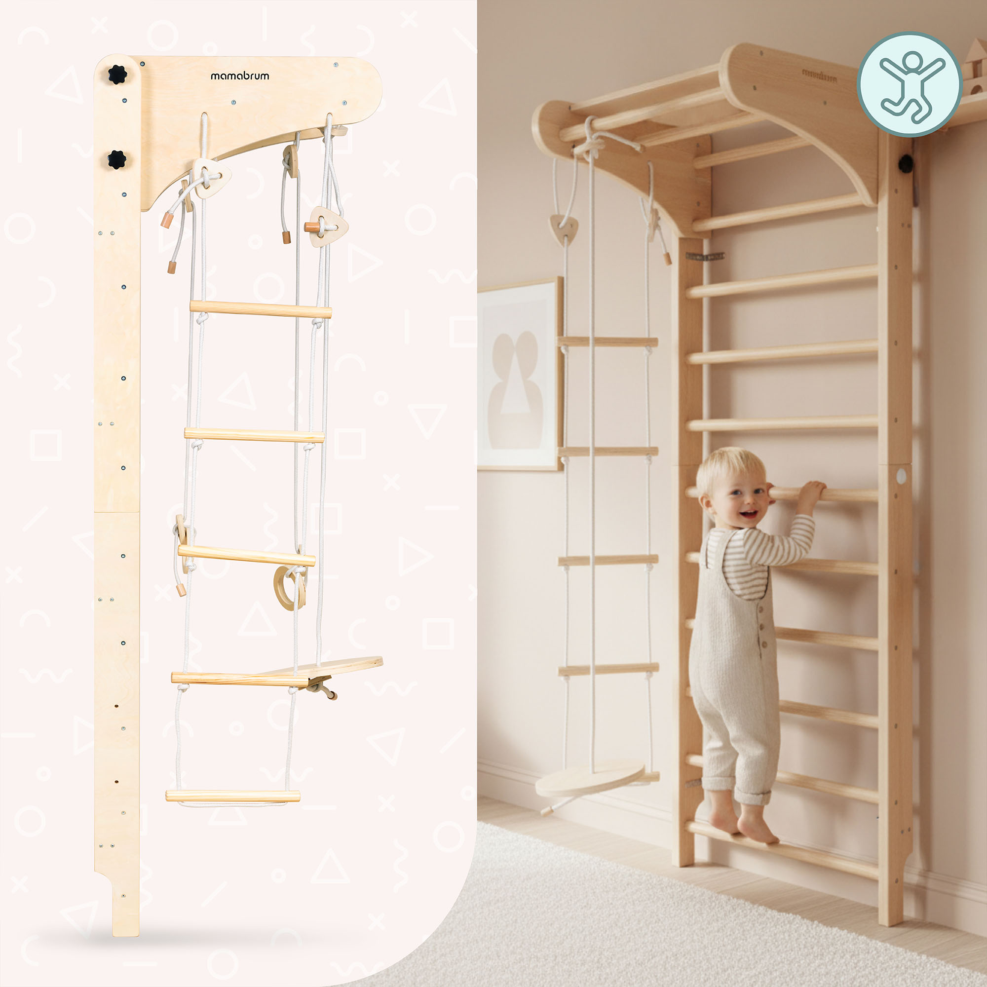 Rebrík obsahuje kompletnú sadu príslušenstva – hojdačka, gymnastické kruhy a rebrík sú štandardom, nie voliteľným doplnkom! Tieto prvky umožňujú deťom hojdať sa, liezť, precvičovať si rovnováhu, vyťahovať sa a skúšať svoje prvé akrobacie. Samotný rebrík sa stáva skvelým miestom na každodenné cvičenie. Je to všestranné pohybové centrum , ktoré podporuje rozvoj koordinácie, sily a obratnosti a zároveň deťom dáva radosť a slobodu objavovať nové aktivity. Je úplne bezpečný, stabilný a určený pre najmenších , čím rodičom poskytuje pokoj v duši a deťom radosť, slobodu a dennú dávku zdravej aktivity.