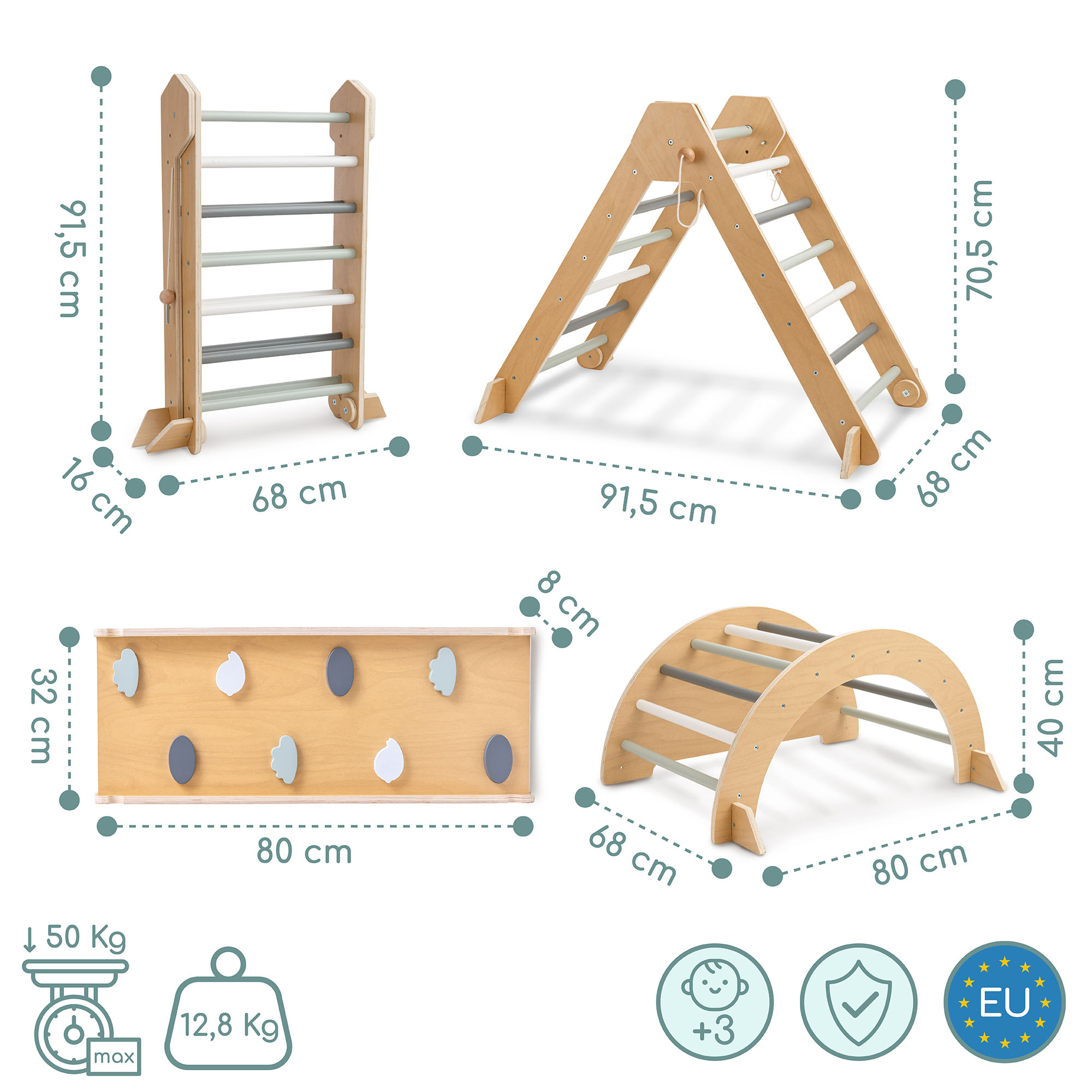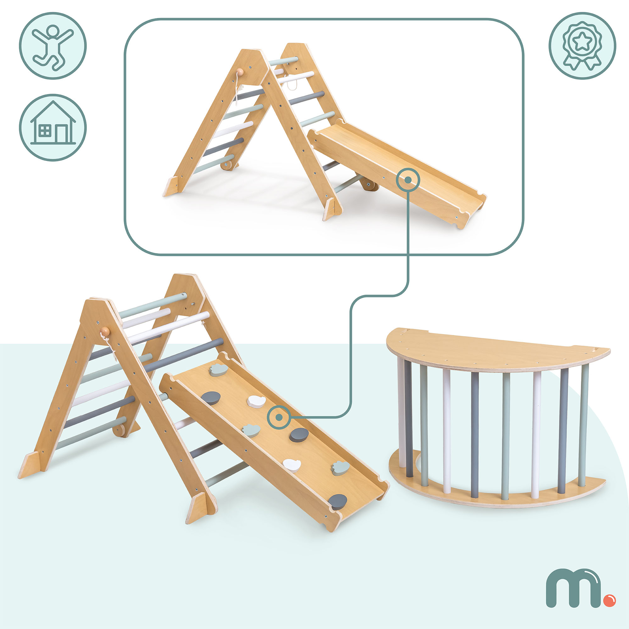 Toto drevené ihrisko je perfektným riešením pre rodičov, ktorí chcú svojim deťom poskytnúť dennú dávku pohybu a zábavy bez toho, aby museli opustiť domov . Ihrisko sa skladá z Piklerovho trojuholníka, lezeckého oblúka/hojdačky a obojstrannej rampy, ktoré sa dajú kombinovať do rôznych konfigurácií . To podporuje lezenie, udržiavanie rovnováhy, šmýkanie a stavanie prekážkových dráh. Táto sada podporuje rozvoj hrubej motoriky, koordinácie a sebavedomia u detí.