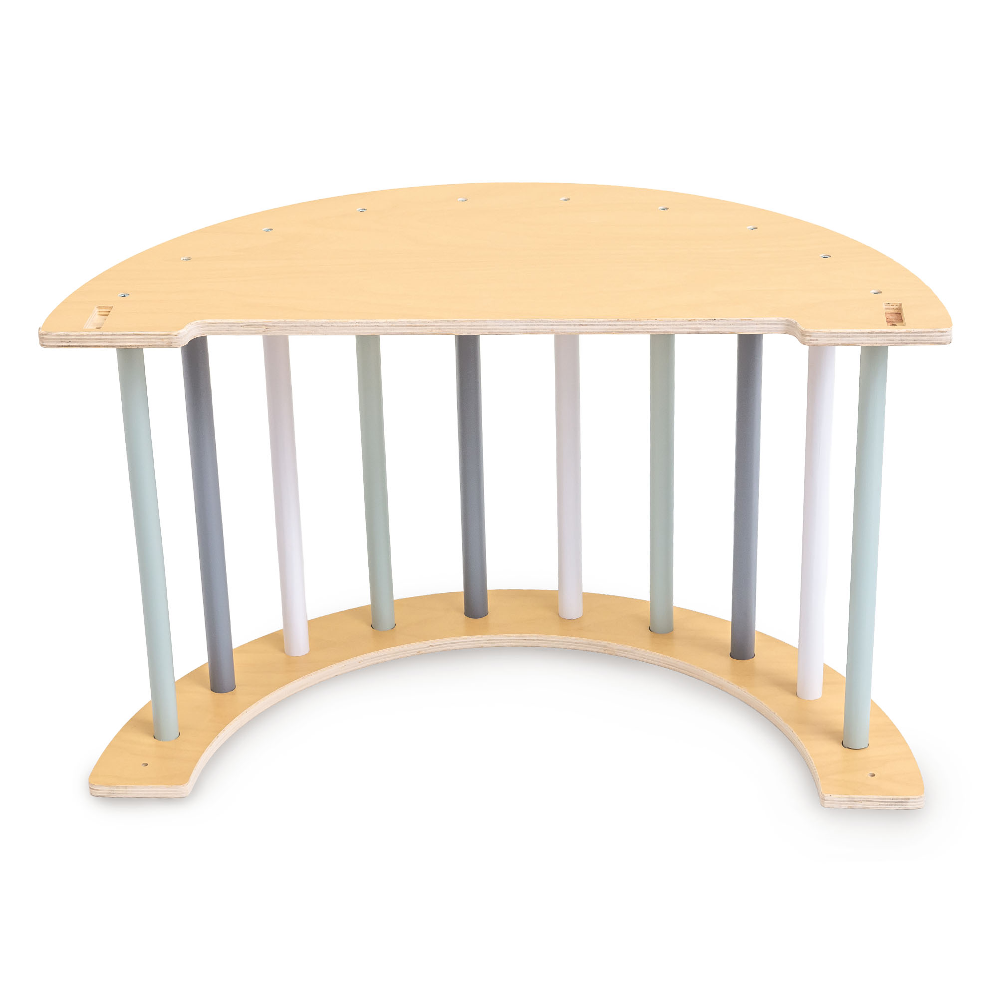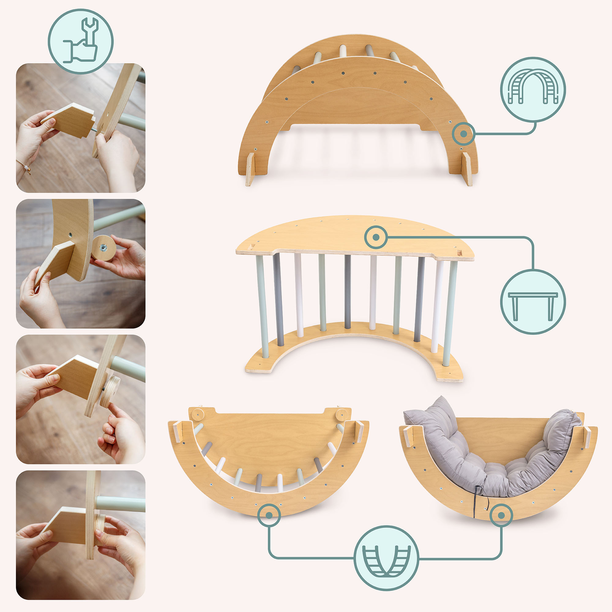 Oblúk podporuje lezenie, udržiavanie rovnováhy a zdolávanie prekážkových dráh . Jednoducho prevráťte oblúk a vložte doň vankúš alebo deku, čím vytvoríte bezpečné hojdacie kreslo , ideálne na tichú a upokojujúcu hru. Oblúk sa dá použiť aj ako stôl , ideálny na kreslenie, hranie sa s kockami alebo čítanie kníh.