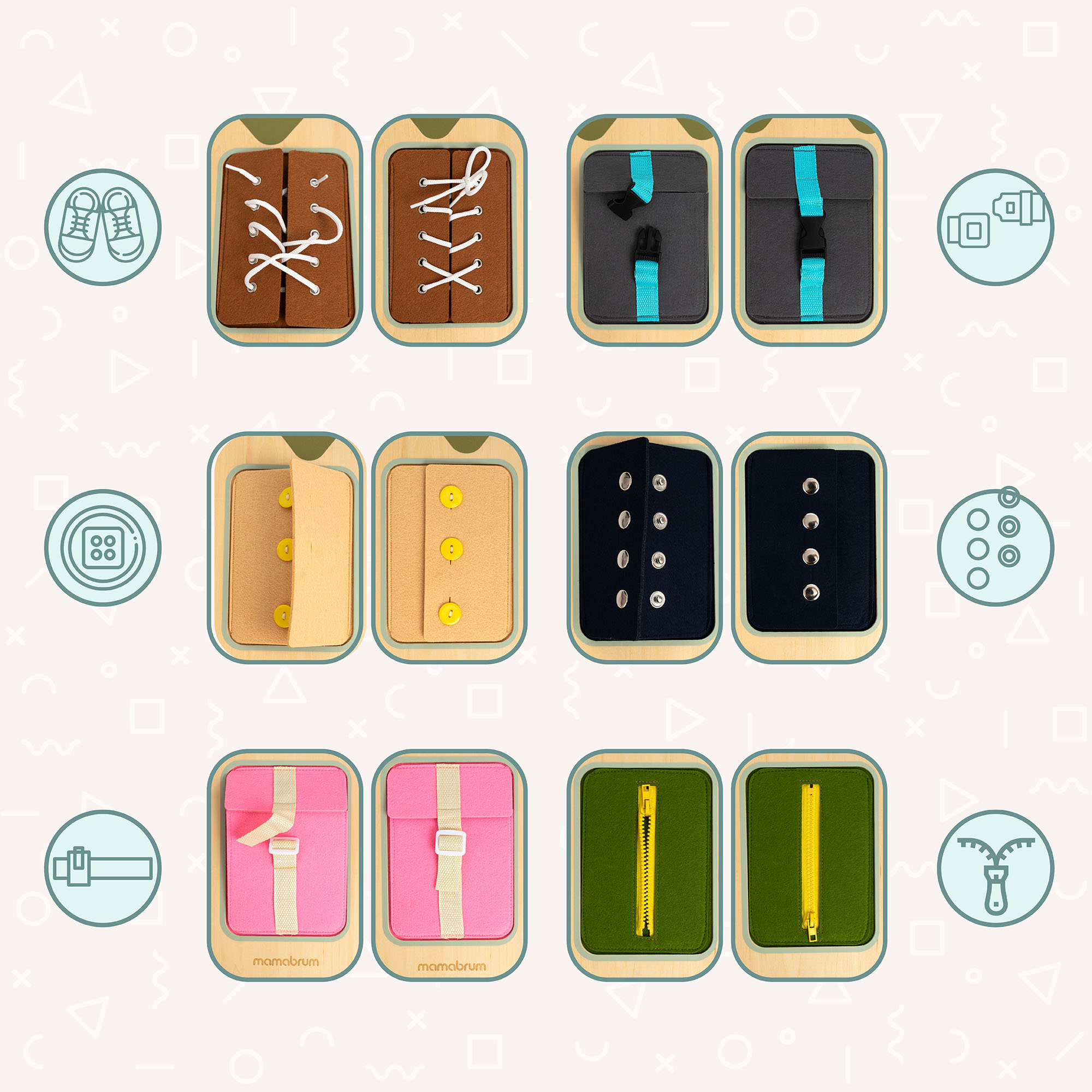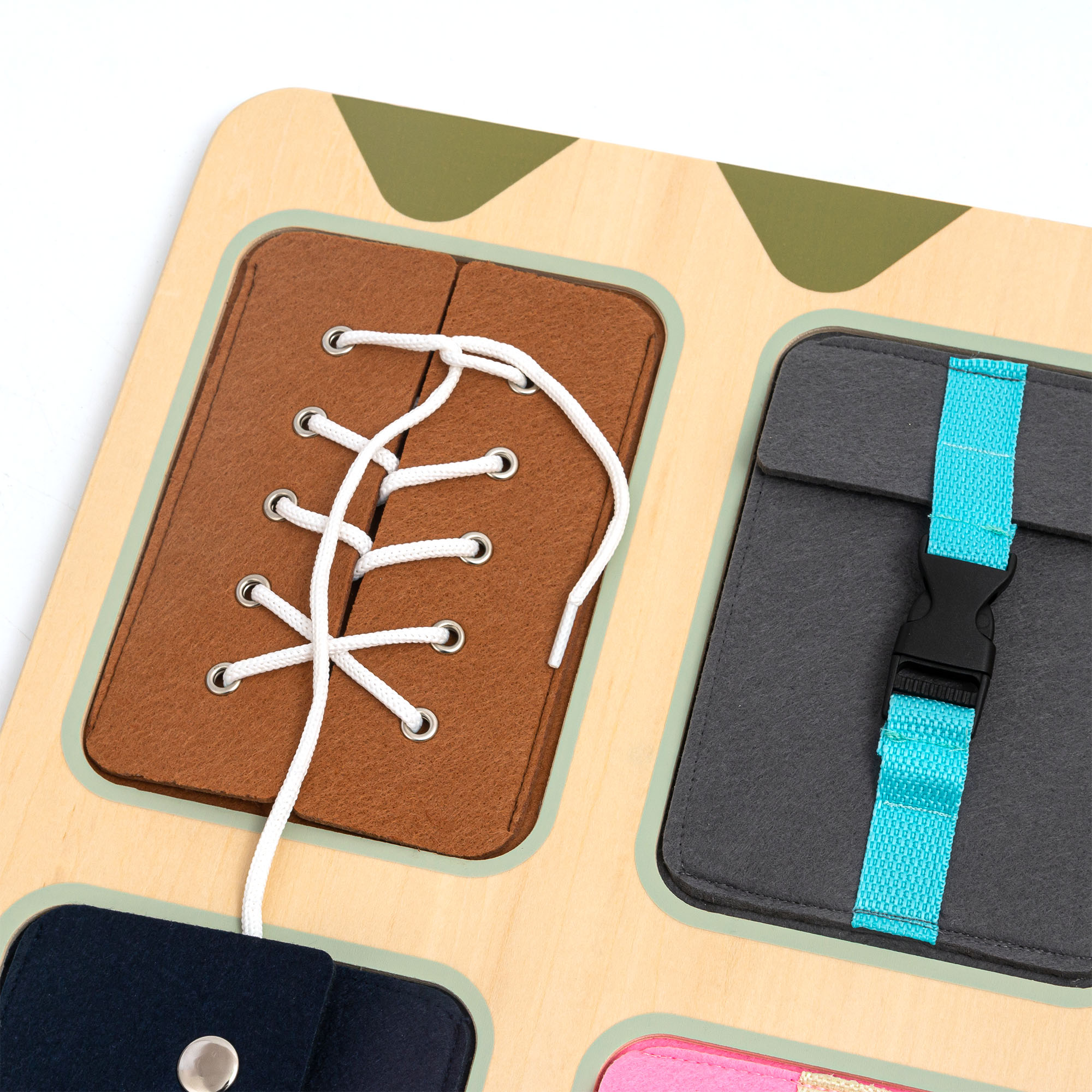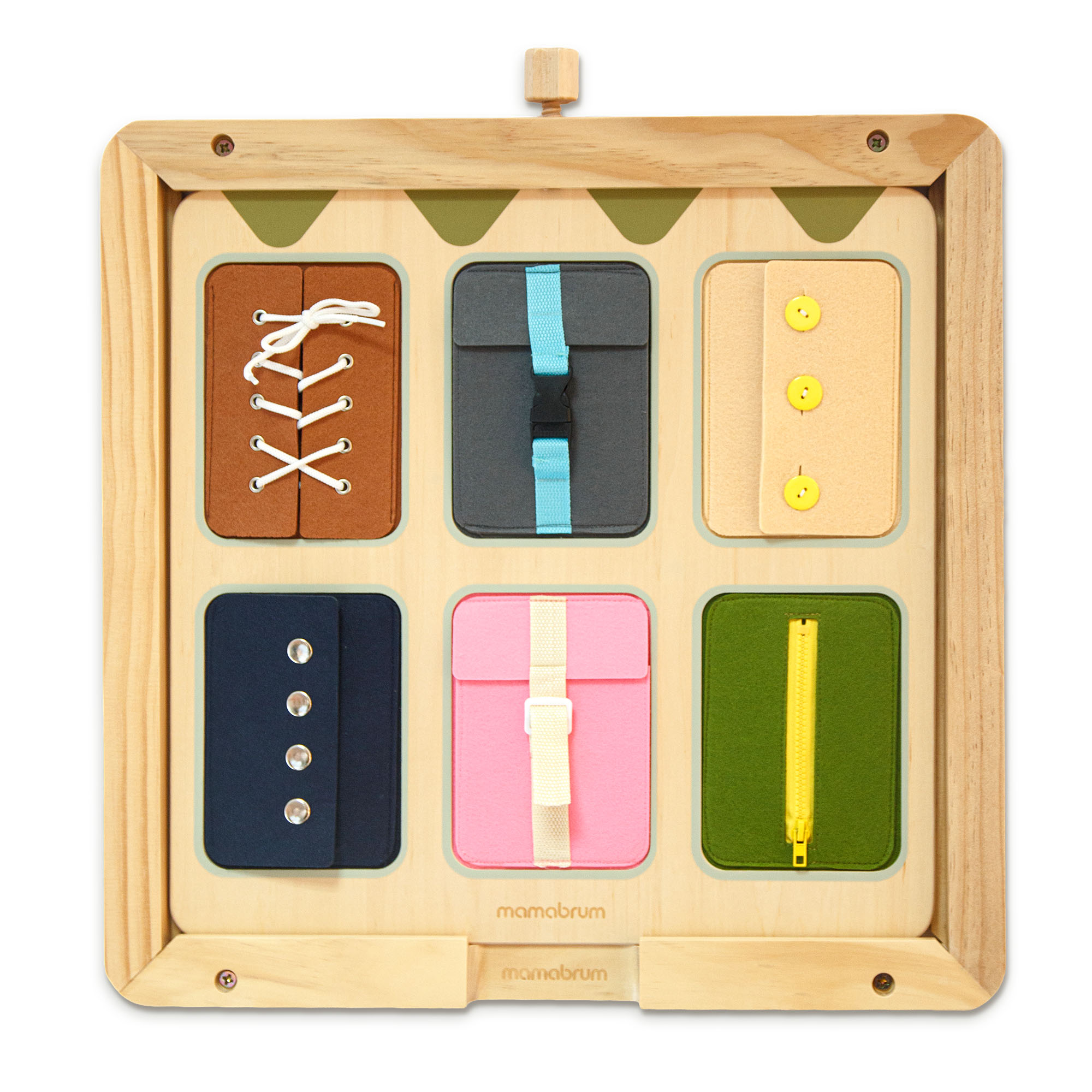 Túto dosku odlišuje od ostatných rozmanitosť prvkov . Batoľatá nie sú obmedzené len na jeden mechanizmus – existuje šesť úplne odlišných aktivít , ktoré môžu preskúmať: šnúrky, gombíky, patentky, pracka na patentku, nastaviteľná pracka a zips. Každý panel predstavuje novú výzvu a iný spôsob hry, vďaka čomu sa deti po niekoľkých minútach nezačnú nudiť. Namiesto opakovania tej istej aktivity dookola majú možnosť experimentovať a objavovať , čo podporuje ich zvedavosť a chuť učiť sa.