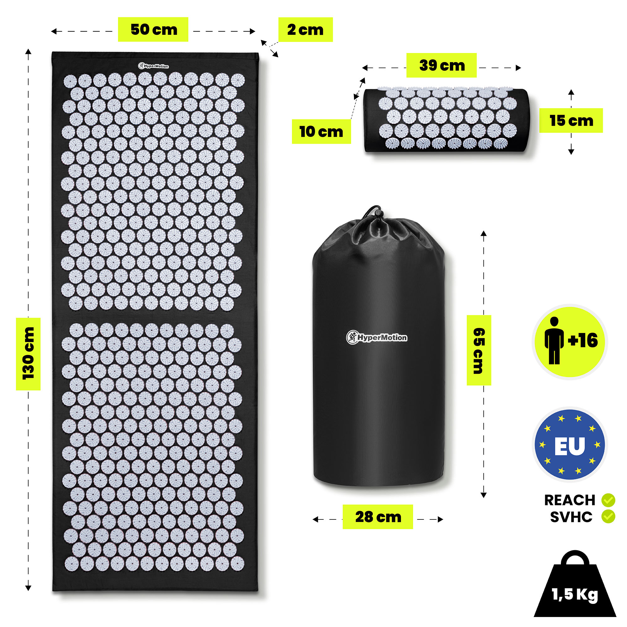 Akupresúrna podložka HyperMotion vo veľkosti XL (130 cm) poskytuje širokú plochu, ktorá umožňuje pohodlnú stimuláciu chrbta, krku, rúk, zadku a nôh v jednom sedení. Pravidelné používanie podporuje prirodzené relaxačné procesy tela, pomáha znižovať svalové napätie a vytvára priaznivé podmienky pre upokojenie a regeneráciu po strese alebo námahe. Akupresúrne hroty sú vyrobené z odolného ABS plastu s bezpečne zaoblenými hrotmi – tento materiál je odolný voči deformácii, stabilný voči tlaku a šetrný k pokožke, čo umožňuje presnú a zároveň pohodlnú stimuláciu povrchových bodov. Podložka je vhodná na každodennú relaxáciu aj ako súčasť domácej zdravotnej starostlivosti, ktorá podporuje pohodu a celkové pohodlie tela.