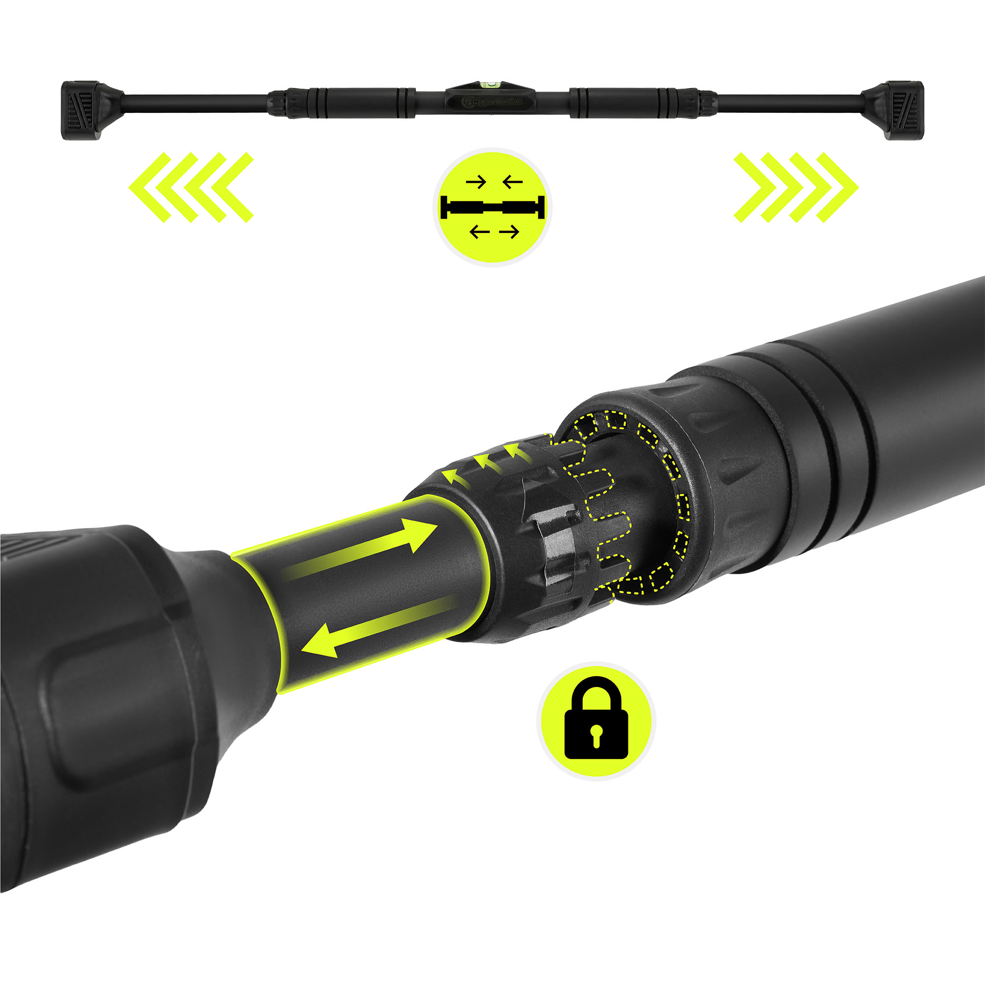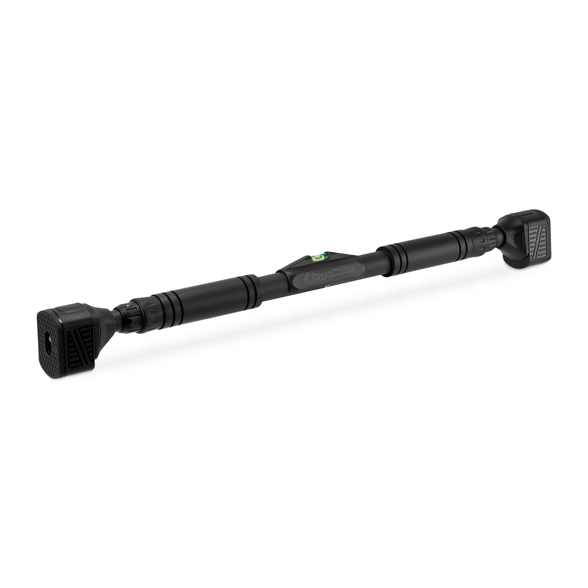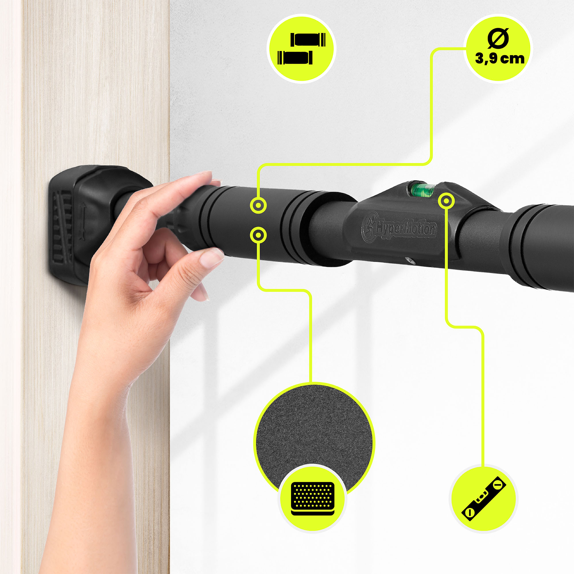 Montážny systém, založený na rozťažnej sile, umožňuje rýchlu, stabilnú a neinvazívnu inštaláciu hrazdy medzi zárubňami bez nutnosti vŕtania otvorov alebo ďalšieho náradia. Pogumované hroty vyrobené z moderného materiálu TPR (termoplastická guma) účinne chránia povrch zárubne pred poškodením a zvyšujú priľnavosť, čím zaisťujú bezpečnú inštaláciu počas cvičenia. Vstavaná vodováha uľahčuje správne umiestnenie hrazdy a pomáha udržiavať jej správnu polohu počas montáže. Vďaka intuitívnemu dizajnu trvá inštalácia len chvíľu a správne namontovaná hrazda zostáva stabilná a pripravená na tréning.