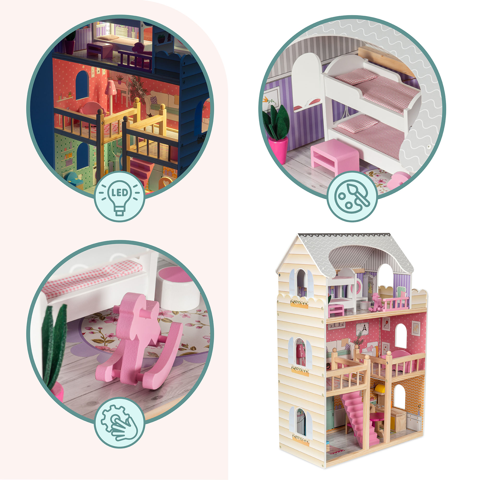 Veľký drevený 3-poschodový domček pre bábiky s terasou, nábytkom a LED osvetlením!