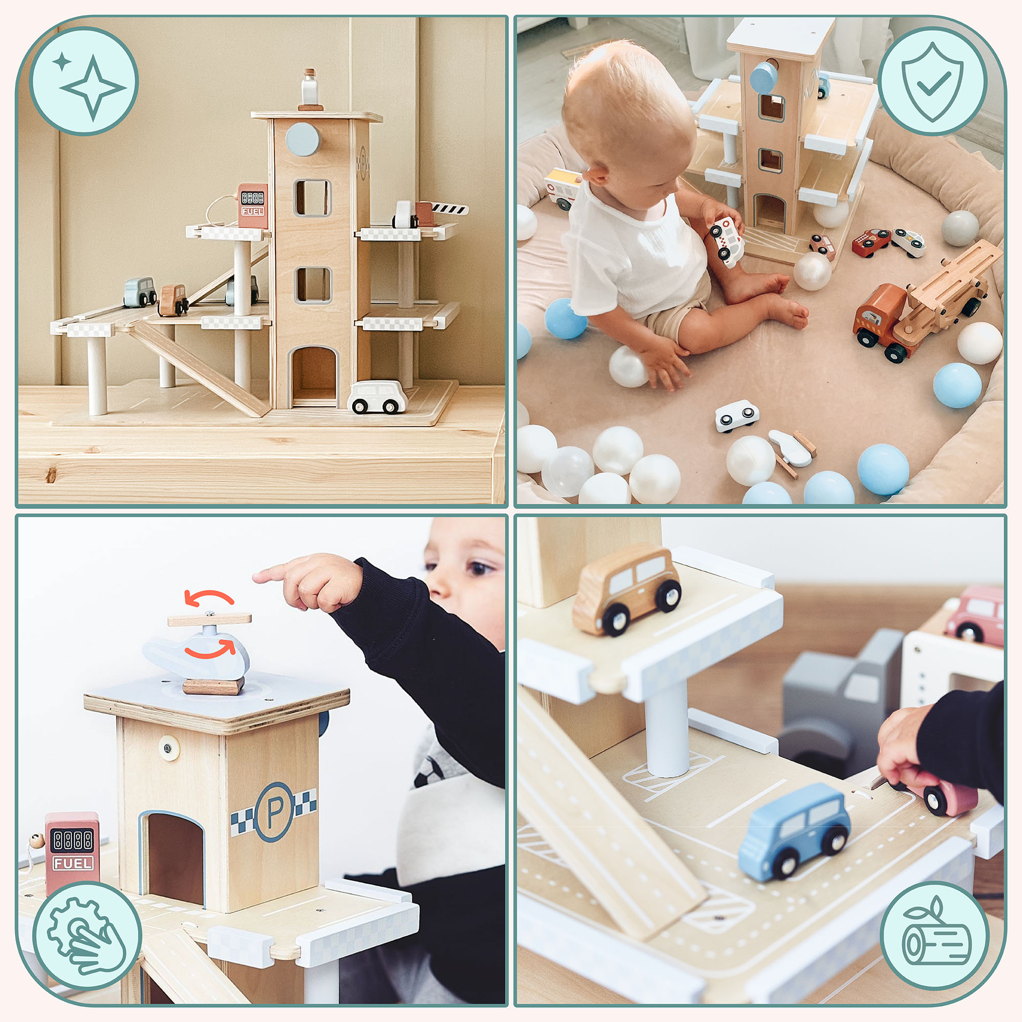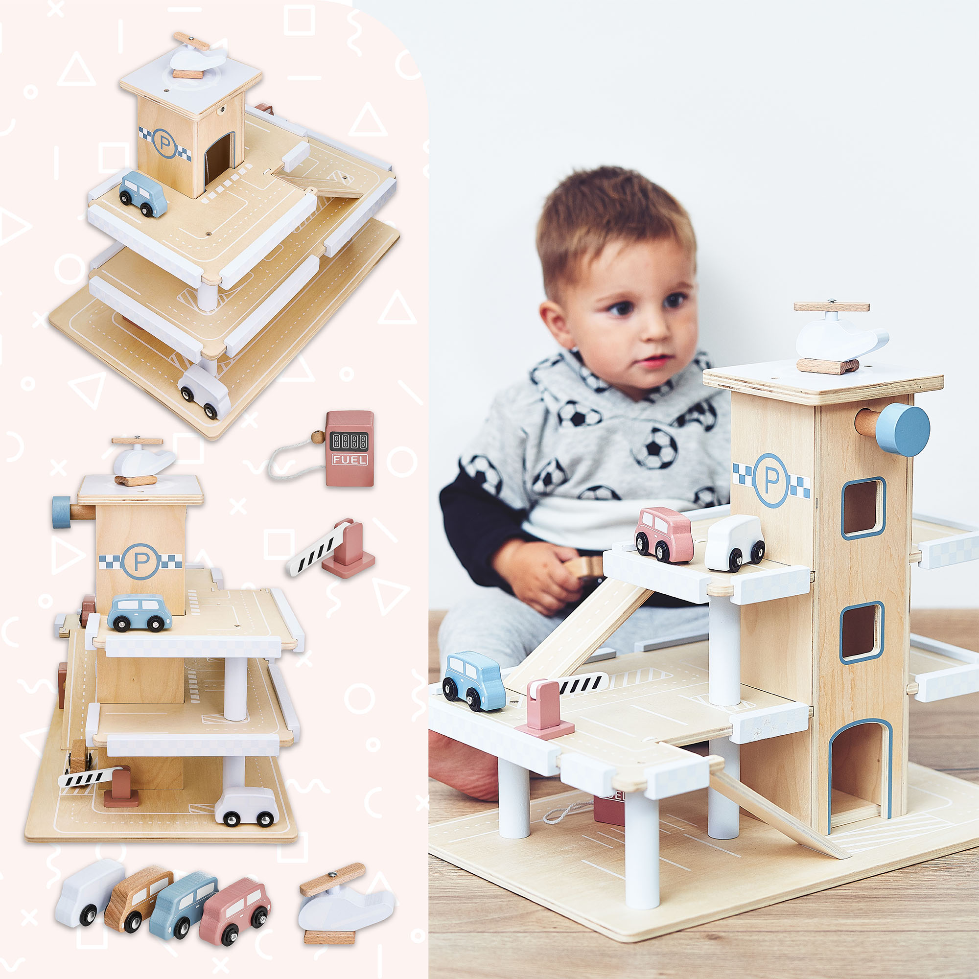 Garáž má tri poschodia a šmykľavku. Tak kreatívne, ako sa dieťa môže hrať s drevenou hračkou. Pri hre si dieťa precvičuje koordináciu oko-ruka. Hračka je vyrobená z kvalitnej drevenej preglejky, doplnky sú natreté ekologickými farbami.