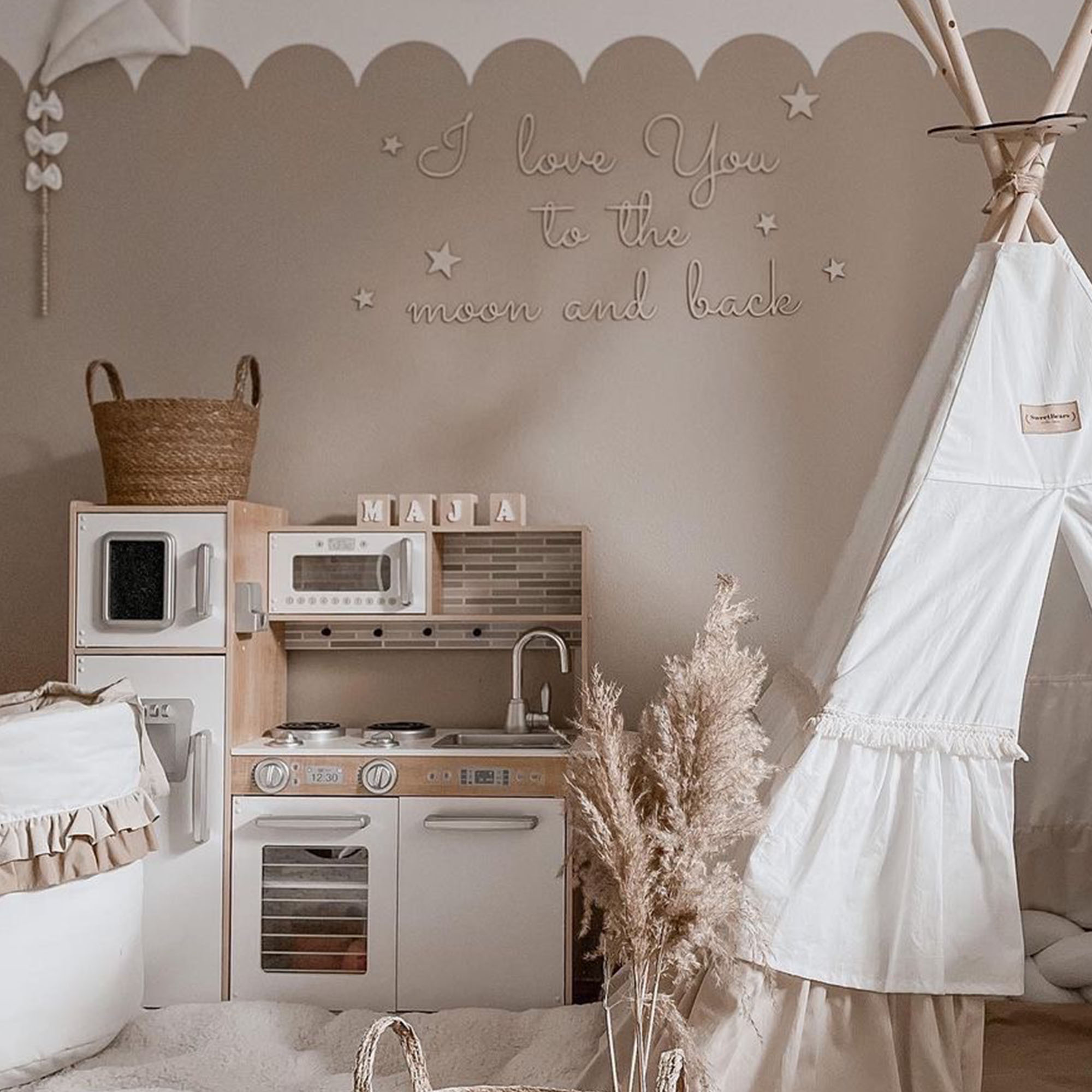 Má tlmené farby, ktoré sa hodia do každej detskej izby. Dizajn kuchyne je dizajnový a jedinečný. Drevená pracovná doska imituje terrazzo. Pohyblivé časti boli starostlivo vyrobené.