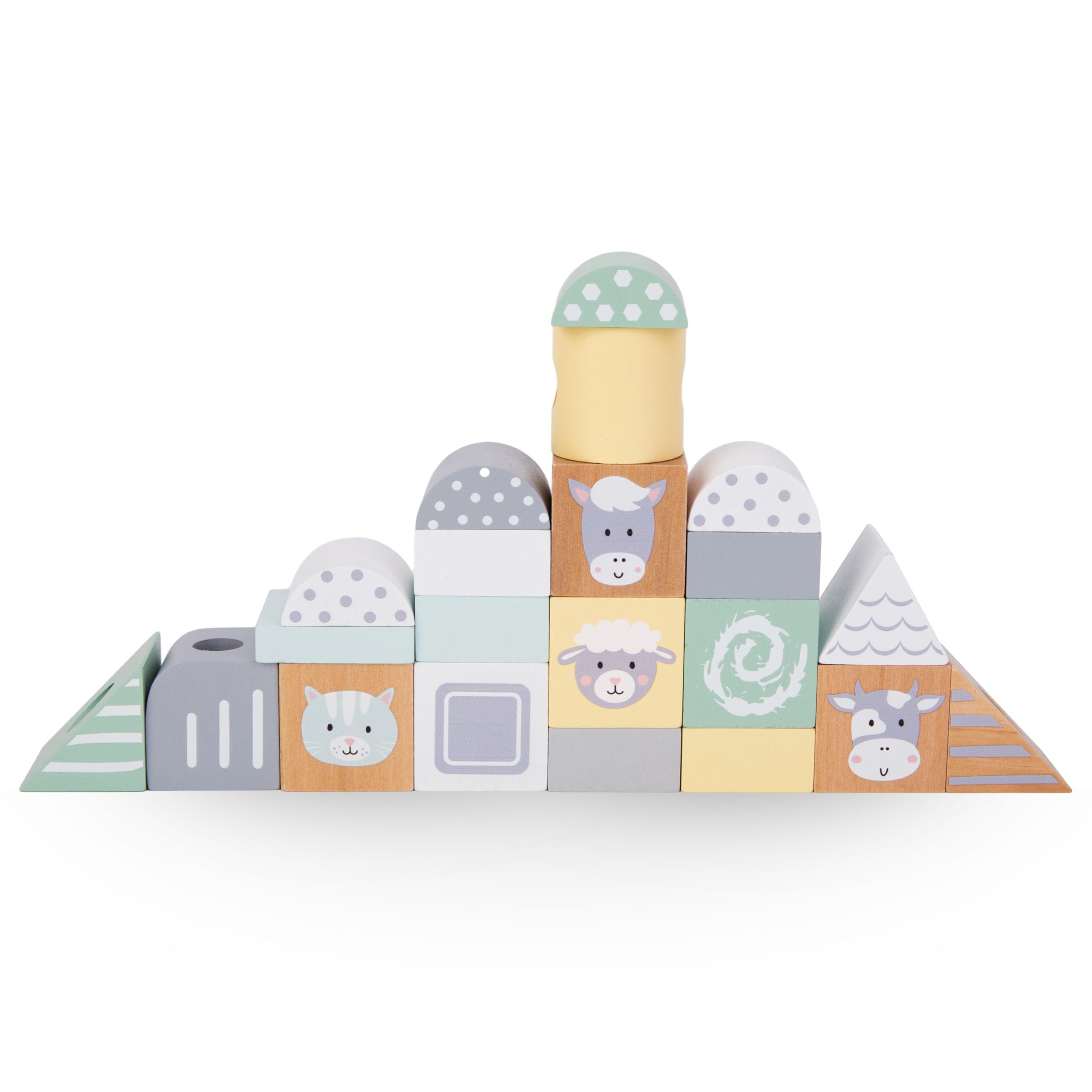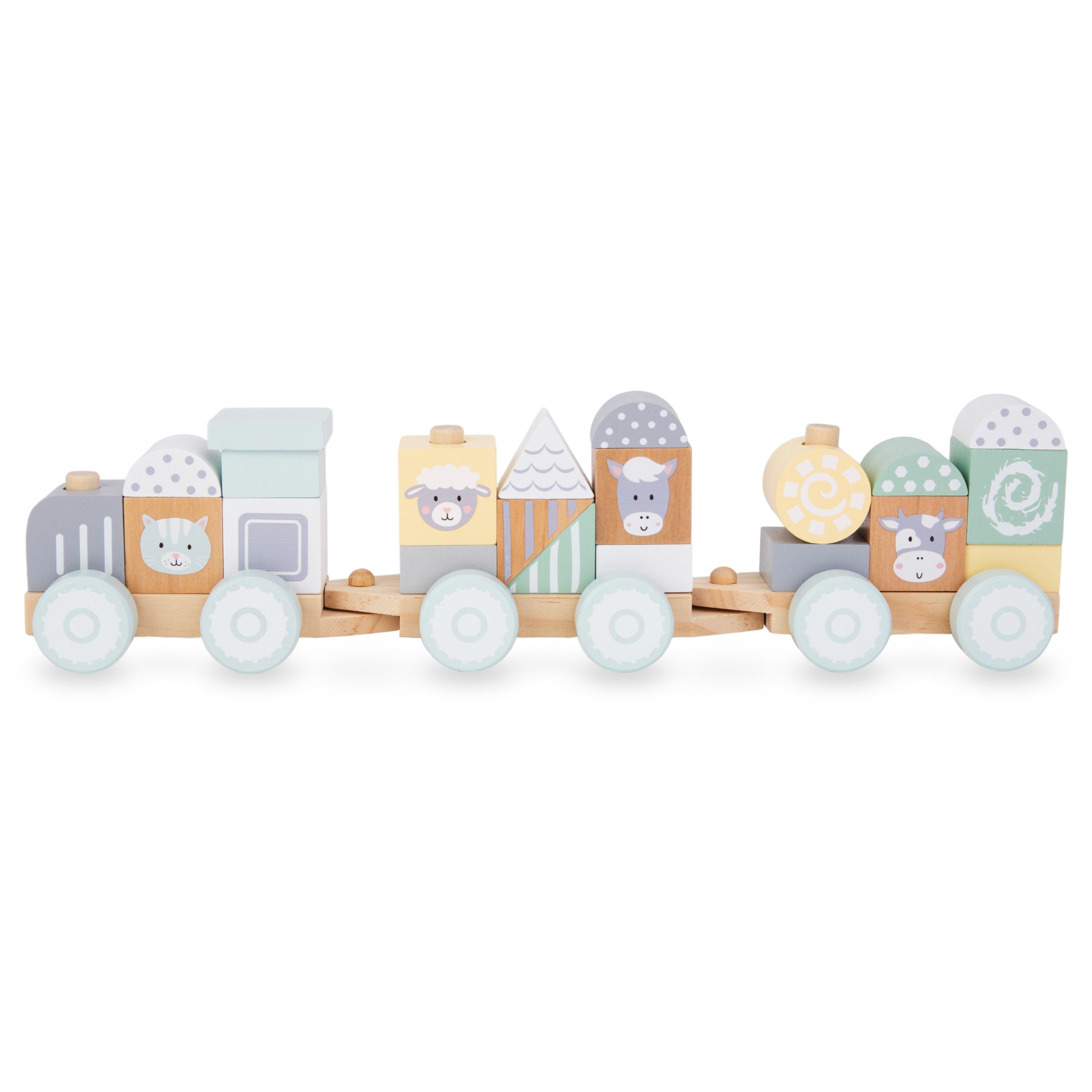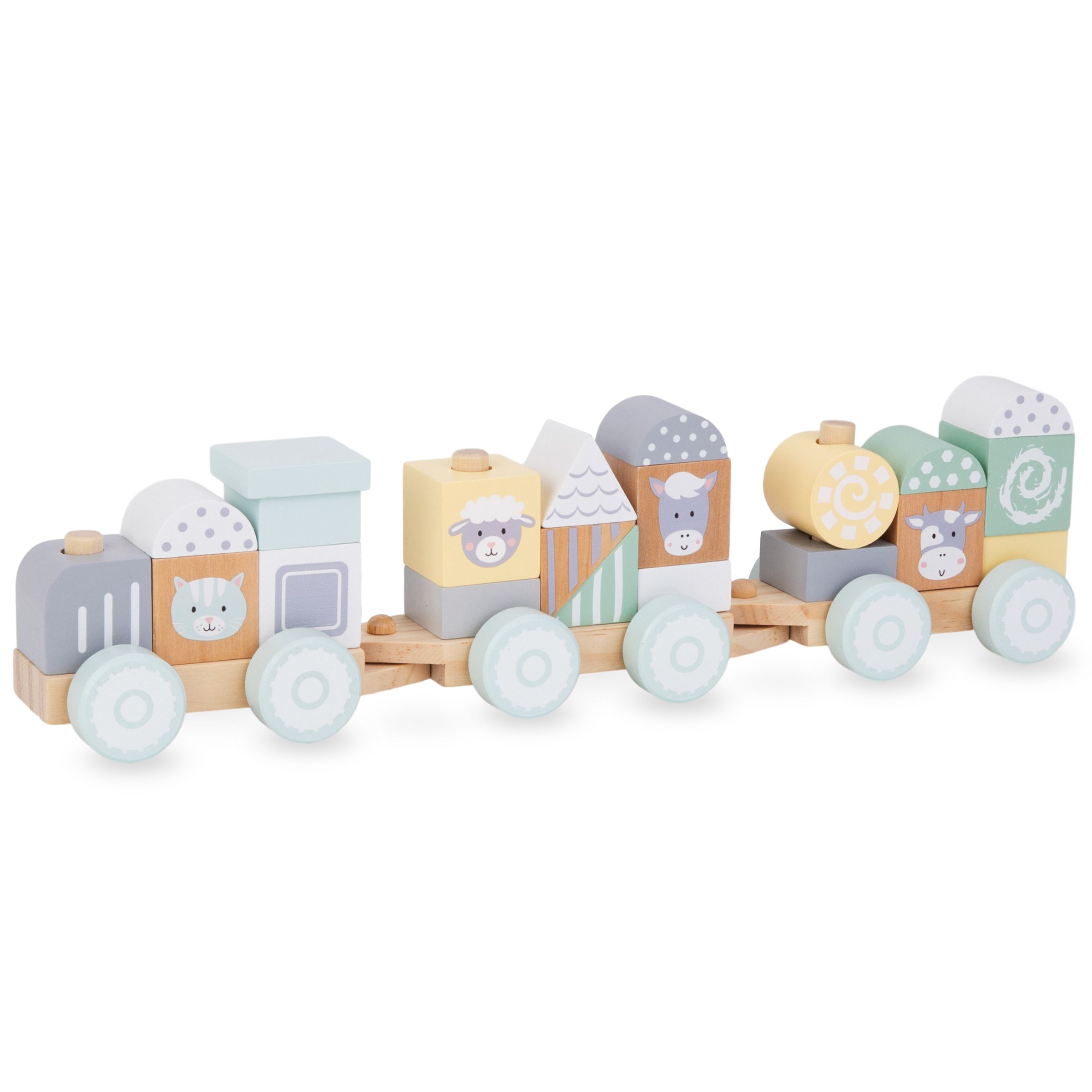 Drevené, kolieskami vybavené vagóny sa dajú spojiť a vytvoriť tak jedinečnú lokomotívu. Navliekaním farebných kociek na špeciálne kolíky si batoľa postaví jedinečnú konštrukciu vláčika. Vlak môže zakaždým vyzerať inak! Keď je všetko pripravené, je čas na jazdu. Počas jazdy môže vaše batoľa odpojiť vagóny alebo zmeniť polohu kociek. Na spestrenie hry súprava obsahuje kocky s obrázkom roztomilých hospodárskych zvierat .