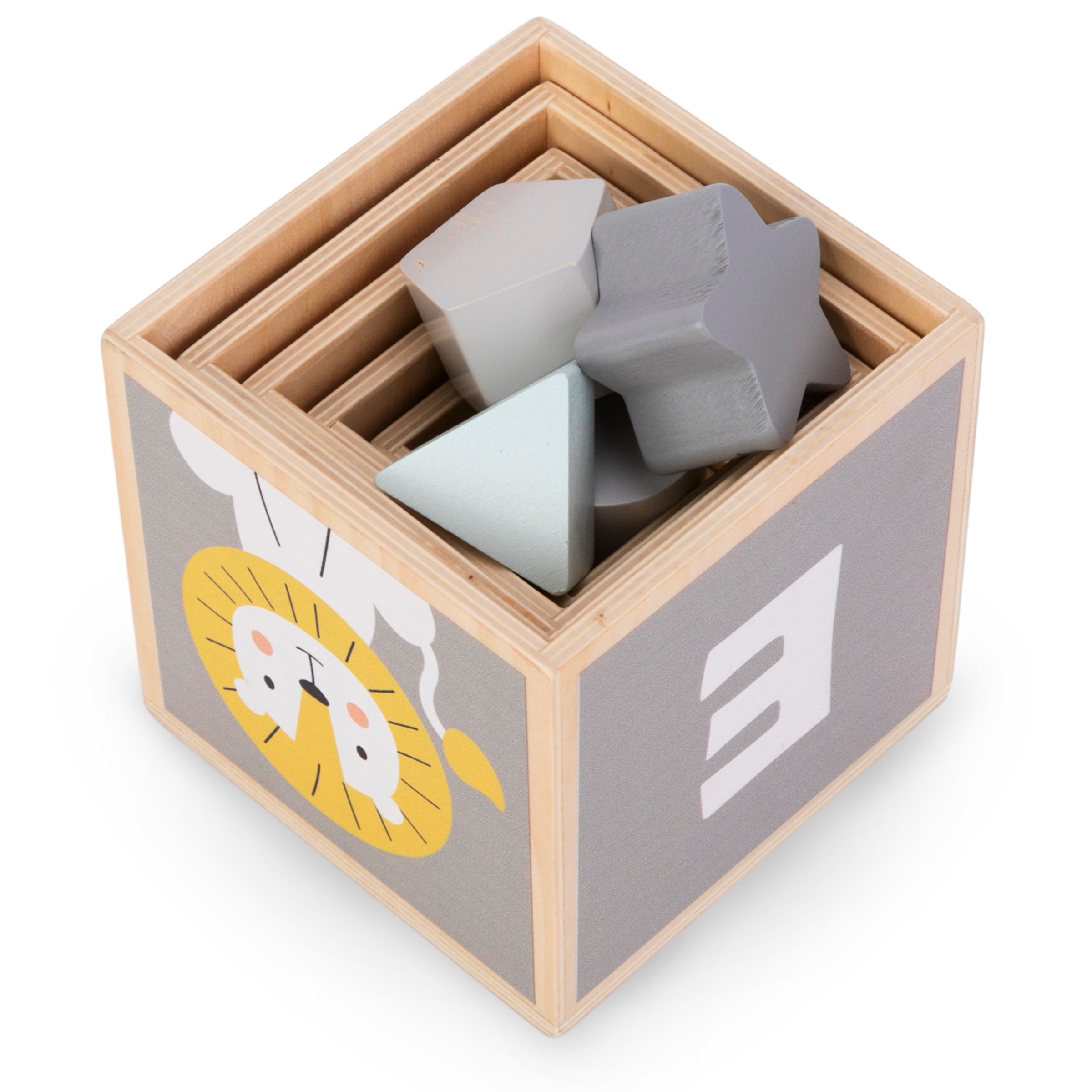 Drevená veža sa skladá z 5 kociek s obrázkom roztomilých zvieratiek. Na ich ďalších stranách sa nachádzajú písmená a číslice a triedič tvarov, vďaka čomu si dieťa precvičí rozpoznávanie a manuálnu zručnosť. Kocky majú rôznu veľkosť - batoľa ich môže ukladať na seba alebo vkladať menšie kocky do väčších.
